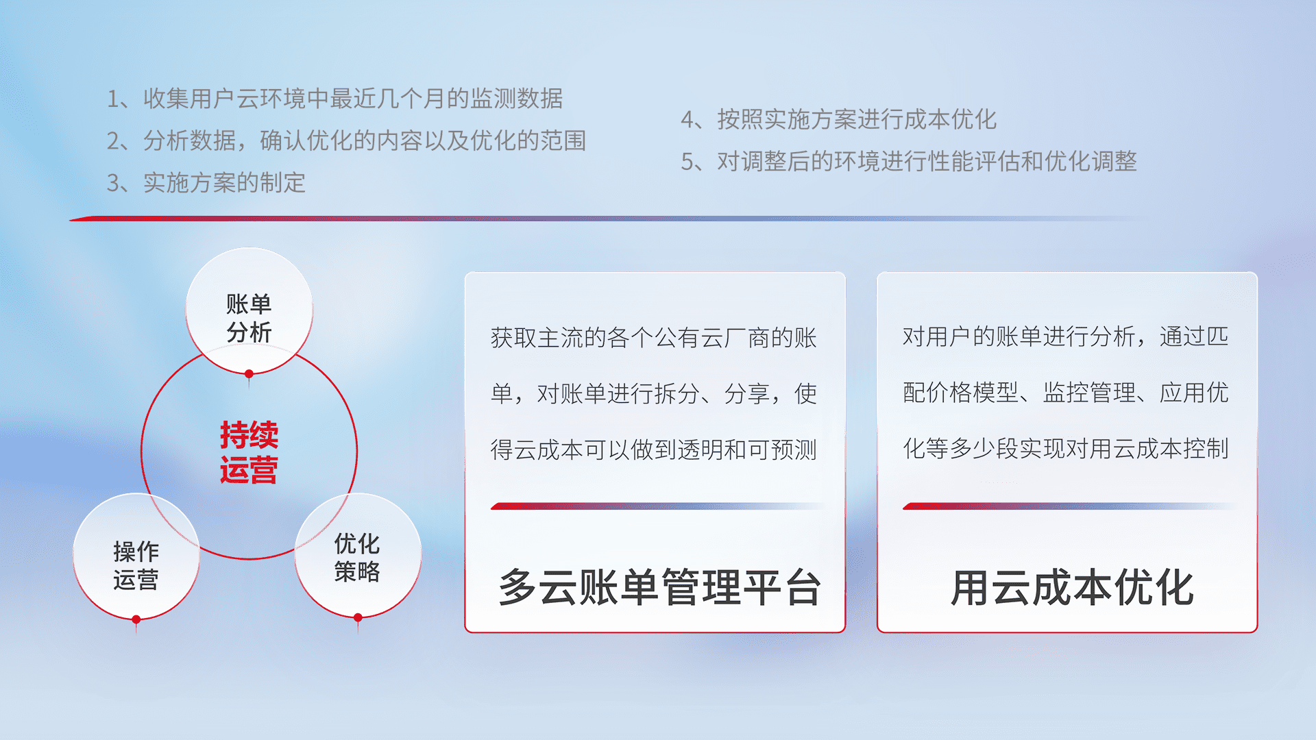 通过多云纳管,,,,以统一的资源数据模型把客户的云资源进行抽象和封装,,,,进而实现对多云资源的统一操作,,保障云资源管理的可靠性、、、、稳定性与可用性。。。量身定制化运维内容,,,配置、、开发运维、、、补丁管理、、、、备份、、、监控、、、认证和访问管理、、、审计和日常巡检等,,,,保障在用云过程中的可靠度,,,,稳定度以及高可用率。。。。